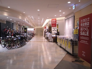 モザイクモールの中の向かい合う自転車屋さんとスーツ屋さんがまもなく